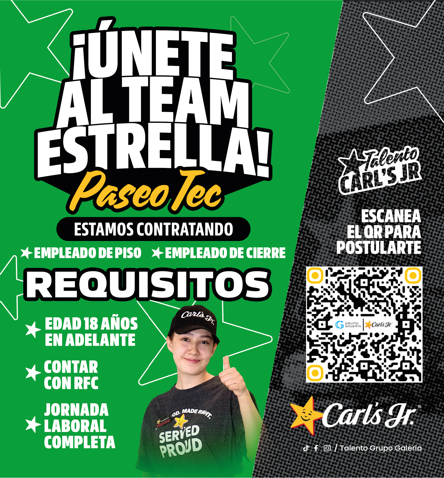 En Carl’s Jr.Paseo Tec estamos buscando gente con actitud para unirse al team 💪🔥