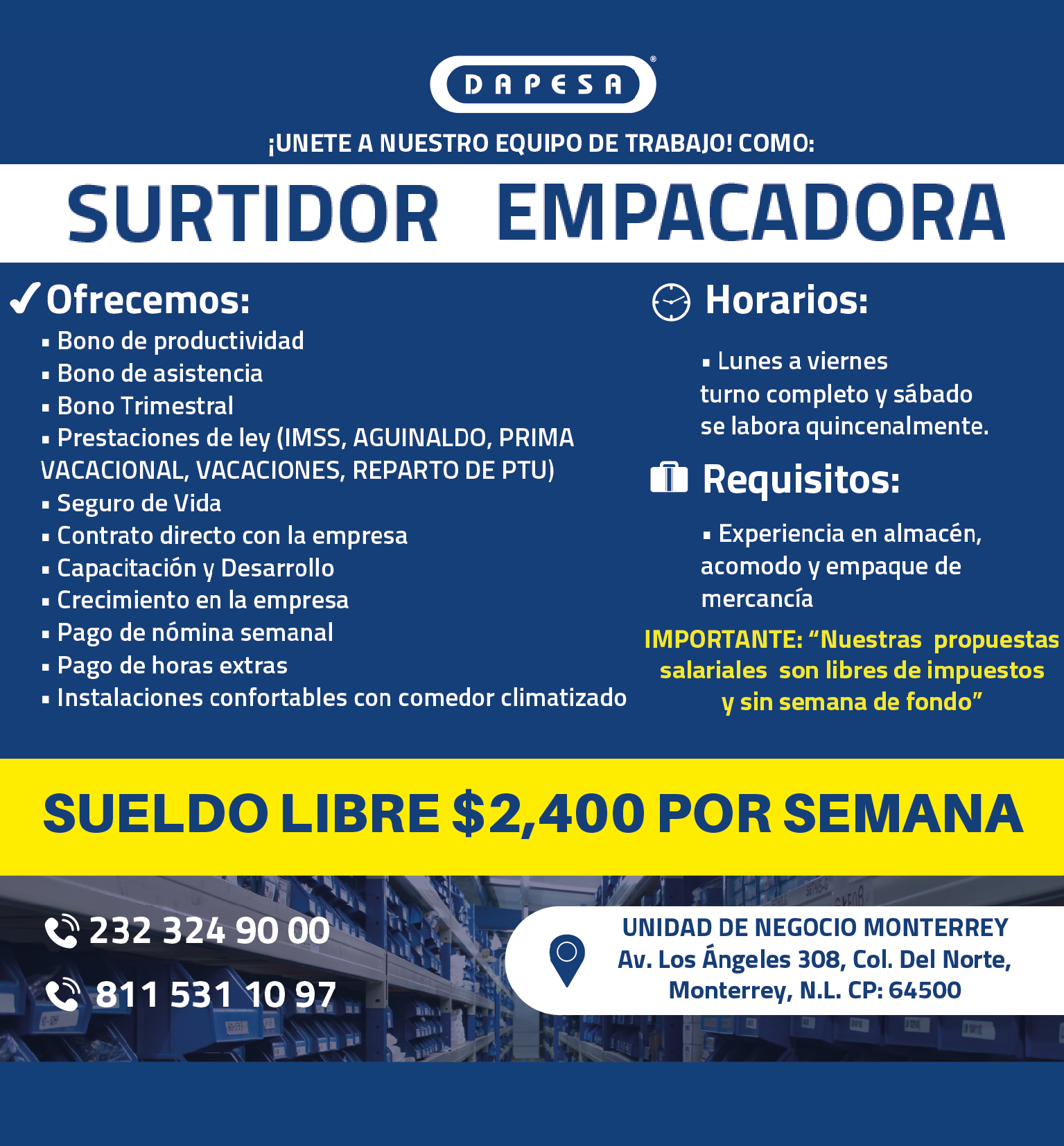 Benefíciate de un bono de productividad, prestaciones de ley, seguro de vida y mucho más al unirte a Dapesa.