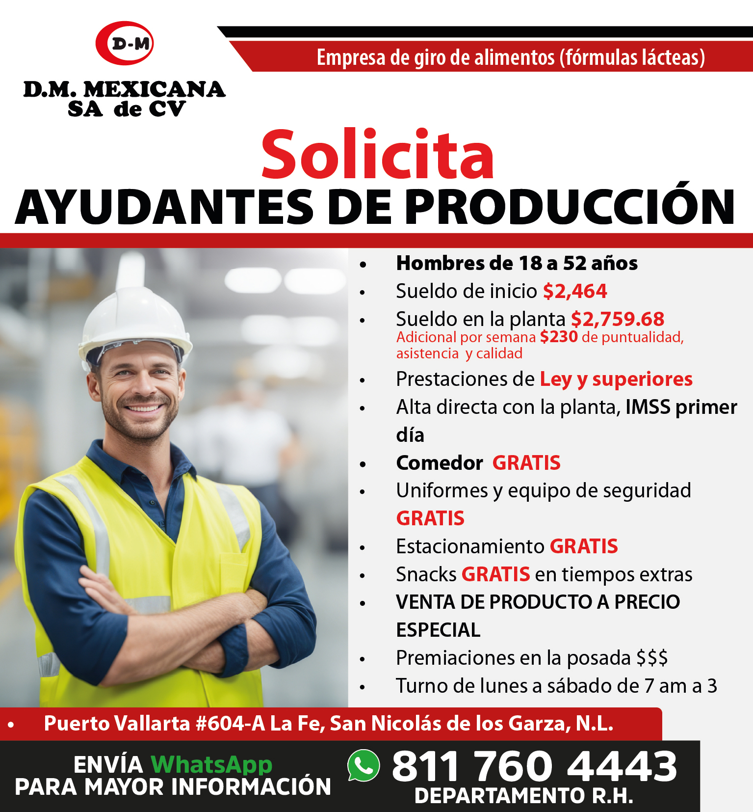 Bono adicional: $230 semanales por puntualidad, asistencia y calidad