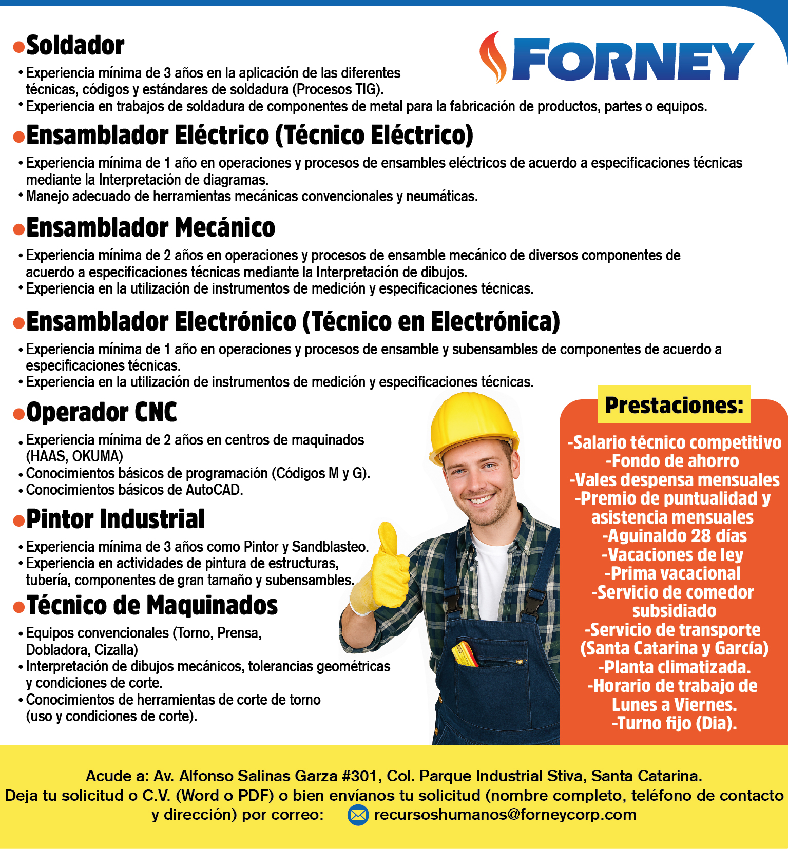 📩 Envía tu solicitud o CV (Word o PDF) al correo: recursoshumanos@forneycorp.com