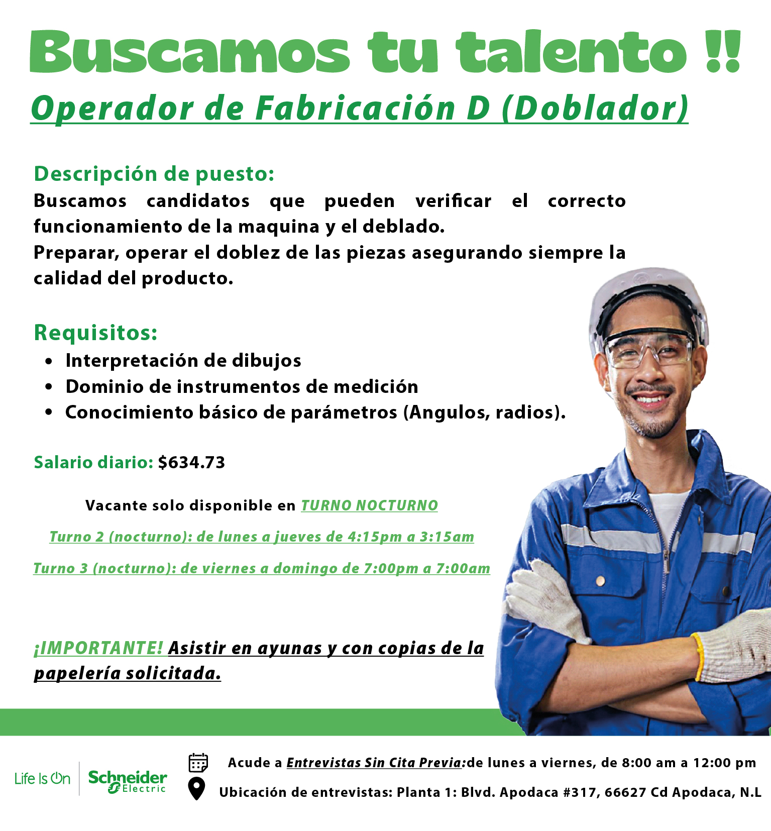 La empresa Schneider Electric está contratando Operador de Fabricación D (Doblador) para integrarse a su equipo de trabajo.